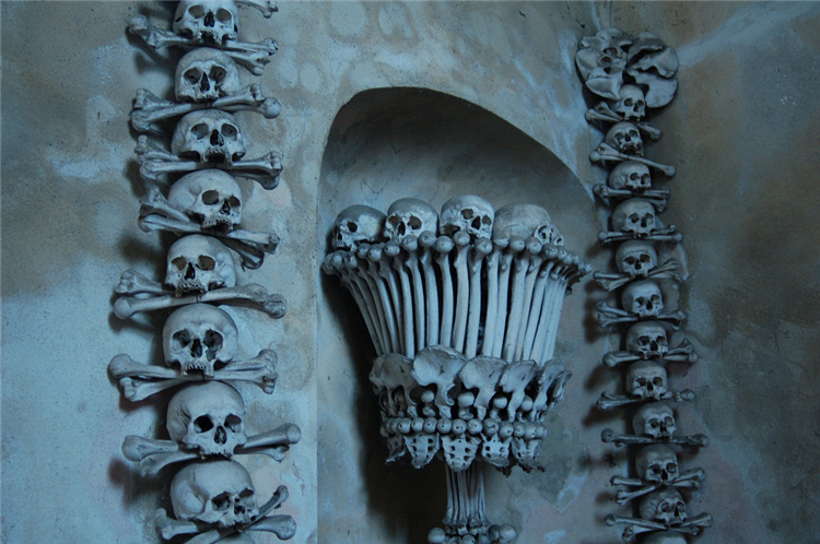 9. 捷克,人骨教堂。这座小圣堂中收藏有四万到七万人的骨架,这些人骨多来自14世纪黑死病和15世纪初胡斯战争杀死的当地人,他们原先被葬在13世纪末建造的公墓里,这座哥德式小圣堂1400年左右建成时掘开了许多墓葬,墓葬中的遗骨就被收藏于其中,因此变成了藏骨堂。
