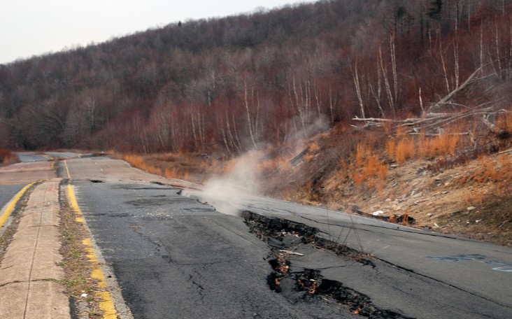 7. 美国森特勒利亚镇,冒烟的鬼城。看过电影《沉默之丘》吗?就是在这拍摄的,1962年的一场大火,把这个小镇彻底烧成灰烬。当时一群消防员为了处理废弃物,不小心在废弃煤矿点了把火,从此小镇地面就经常出现毒气、冒出地下火甚至导致路陷,不管居民如何补救,有毒气体还是不断大量排出,最后大家只好抛弃这个小镇。