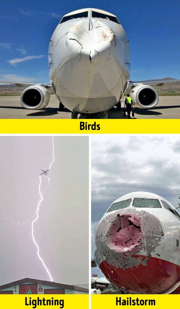 闪电很常击中飞机,但乘客通常不会发现,只有极少数的情况下会造成飞机停电,但机师能够使飞机恢复电力系统,让飞行持续。鸟类可能带来的危险远比你想象的还要大,万一它们被卷入涡轮,可能会毁掉引擎甚至造成起火,而且不是所有挡风玻璃都能够承受鸟类的撞击,因此通常会用特殊声音装置吓走鸟类。冰雹跟鸟一样危险,但坏天气比较好预测及避免。