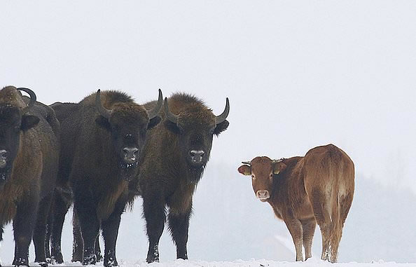 这头母牛属利木赞牛(Limousin)品种,呈红棕色,体型比深棕色的野牛小,所以在野牛群中显得很醒目。它在几个月前就在波兰的社交媒体上走红,当时人们认为它在野地里不会待太久。