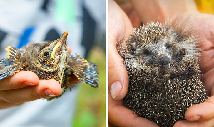 有时候去野外多多少少会遇到一些受伤的动物,不过有时候拯救这些动物不一定是好的选择,例如你不应该捡起一只掉出巢穴的小鸟,因为在这个阶段你没办法养育一只小鸟,他们主要吃小毛虫和蛆。而明亮而美丽的毛毛虫可能有毒,而无害的刺猬常常会有些不愉快的疾病。