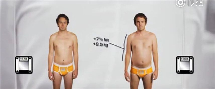而外表可见的部分呢,戴蒙在这段时间内直接胖了8.5公斤、体脂率提高了7%、腰围大了10厘米、身上其他部位看起来也明显变胖。加上糖扰乱了新陈代谢,戴蒙狂长痘痘粉刺、还出现明显的眼袋。