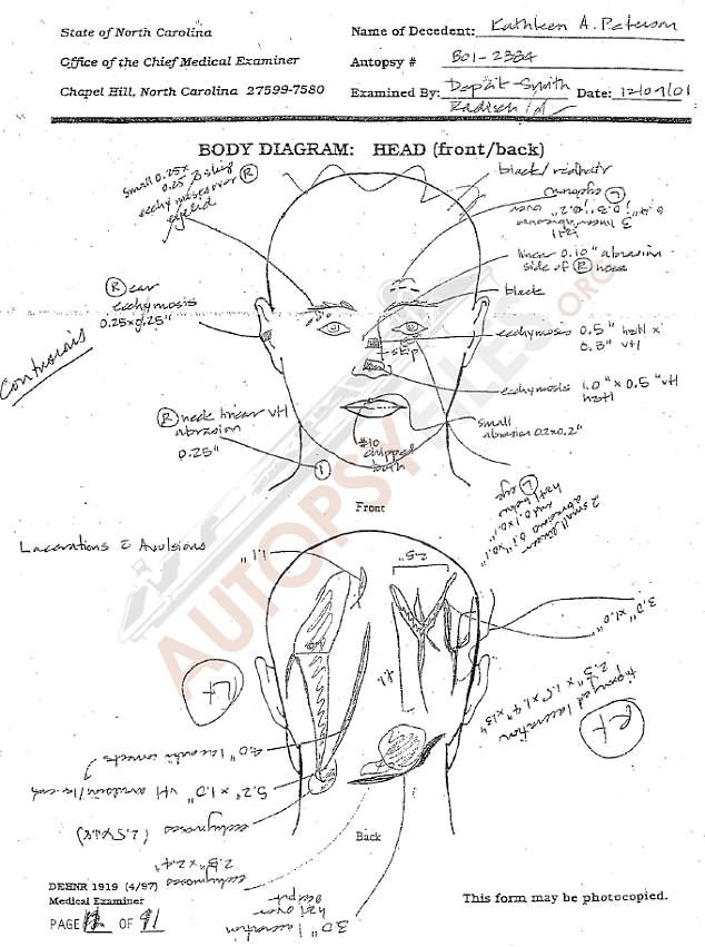 验尸报告上,Kathleen全身上下总共有35处淤青、伤痕和伤口,头皮有7处撕裂伤,手臂、手腕和手上有防卫伤,脸上,背上还有各种淤青。