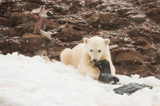 这两只北极熊和妈妈一起被发现在斯瓦巴群岛 (Svalbard) 的海岸上,这是一个位在挪威大陆与北极点两者正中间的群岛,黑色塑胶袋在一片雪白世界和纯白的北极熊周围显得格外显眼,北极熊们没见过塑胶袋,好奇的用熊掌抓了抓塑胶袋,之后还将塑胶袋放入口中。