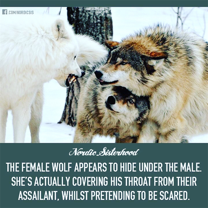 上面的照片表示“女狼躲在公狼后面假装害怕,但实际上她正在保护男性的喉咙被伤害。” 不幸的是,这只不过是一个故事。摄影师让·保罗 (Jean Paul) 说,在战斗中,她其实是设法要在狼跳回来的那一刻抓住他。此外,很有可能,照片中的3只狼都是男性。