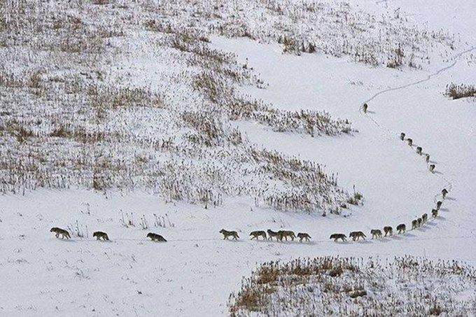 曾有人表示,这张照片中前三只狼是老狼或者病狼,让它们来领头,制定狼群移动的速度;在来的5只狼则是最强壮的;后面接下来的一排则是狼群里所有的狼,在它们的后面保持一点点距离的则是另外5只比较强壮的狼。前面5只狼和后面5只狼身负保护中间这些狼的责任等等充满学问的解释,但摄影师杭特 (Chadden Hunter) 则解释说,这是狼猎取野牛的方式,最前面的通常只有强壮的公狼。