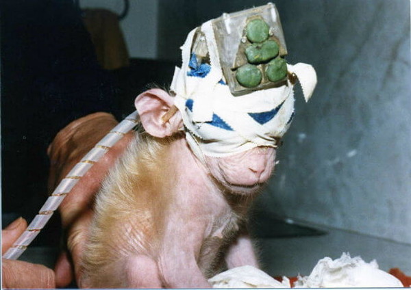 1985年,国际动物保护组织PETA在加州大学河滨分校拯救一只惨遭动物实验的猴子Britches,当年为了进行脑神经研究,Britches被迫和母亲分开,住在冰冷的实验室里。