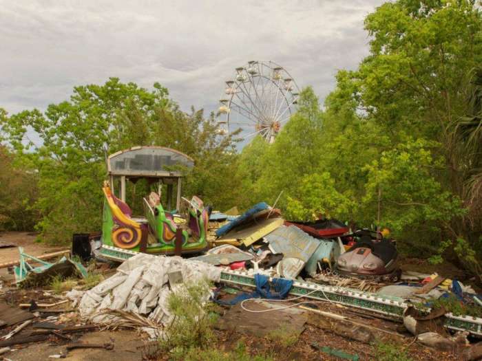 腐烂的游乐设施与就像世界末日般的景观充满了飓风破坏的痕迹。