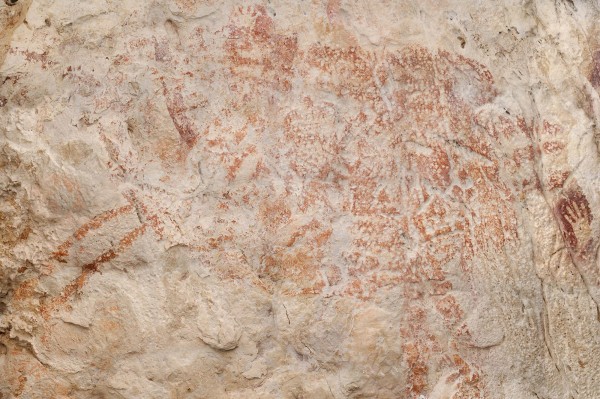 科学家将洞穴中画作依年代分阶段,第一阶段画作有赭石手模;第二阶段画作有桑葚色的手模、以及复杂的图案与人类图案;第三阶段画作有人物形象画、船只与几何图形。