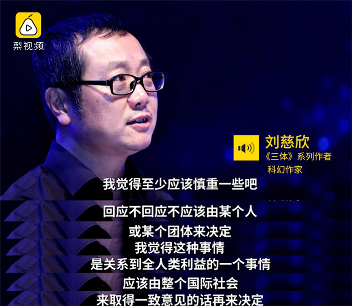 根据《梨视频》报道指出,科幻作家刘慈欣认为,“这种电波后来大部分都被证明是自然现像,至少不是只能发送”,“我是不会回应的,至少现在不要立刻回应”,会继续了解监听,并希望能够破译其中的一些信息,且这“是关系到全人类利益的一个事情,是否回应,该由国际社会来决定。”