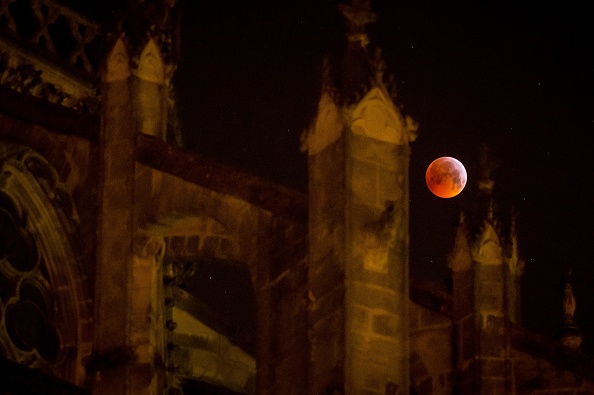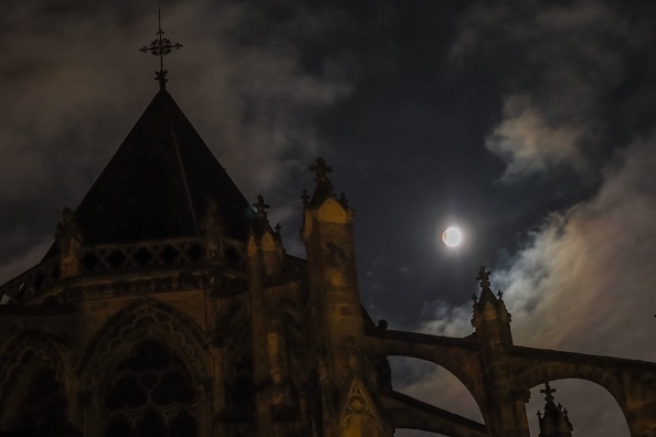 图为2019年1月21日,三大天文奇观合一的“超级血狼月”登场,在法国中部的图尔大教堂后面,月全食期间,月亮完全被地球阴影笼罩。