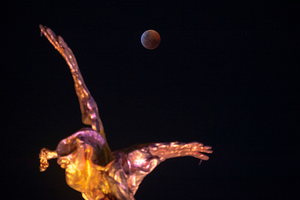 图为2019年1月21日,三大天文奇观合一的“超级血狼月”登场,在墨西哥城拍摄到的月全食期间,月亮完全被地球阴影笼罩。