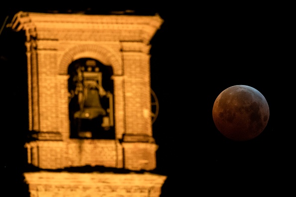 图为2019年1月21日,三大天文奇观合一的“超级血狼月”登场,在意大利西北部萨卢佐的“圣贝纳迪诺教堂”,月全食期间,月亮完全被地球阴影笼罩。