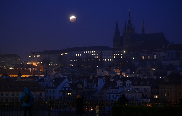 图为2019年1月21日,三大天文奇观合一的“超级血狼月”登场,在捷克首都布拉格的月蚀期间,月亮从地球阴影穿过。