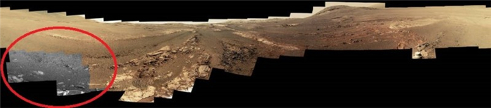 NASA昨天公布机会号去年6月遭遇“致命”沙尘暴前回传的最后一组全景影像,纪录它殉职前一刻在火星地表踏下的临终足迹,其中左下角的区块呈现灰阶黑白,与彩色部分相异,显示机遇号的过滤器在庞大沙尘袭击下无法顺利运作,导致机体组件在风暴中逐渐失能。