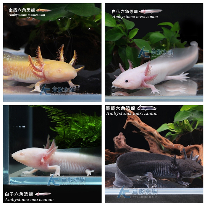 墨西哥蝾螈在原生地已经是濒临绝种的极危物种,现在水族馆贩售的几乎都是由人工繁殖与改造的人工种,常见的品种依照色系分别为:金箔、白化、白子、墨蓝、虎斑。