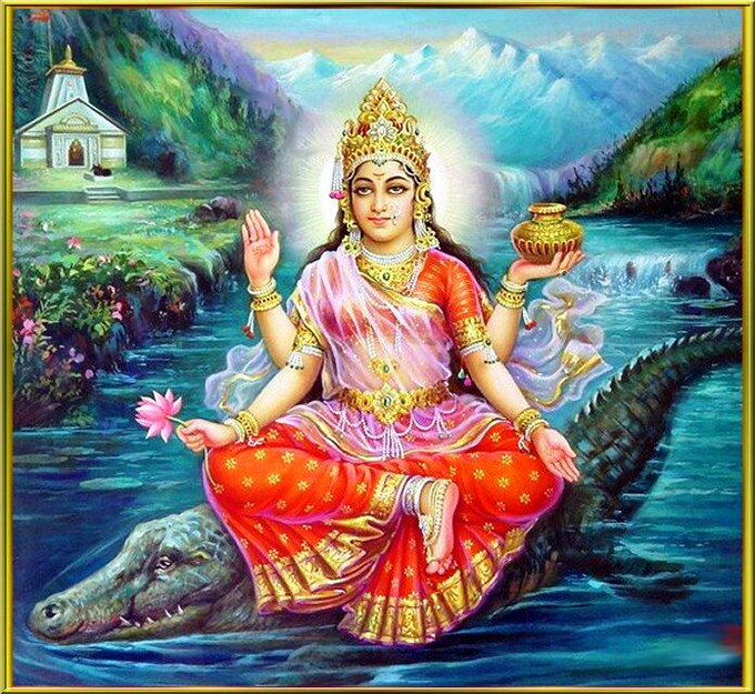 按照印度神话记载,恒河女神为雪山神(喜马拉雅山的人格化)的女儿,与湿婆的老婆雪山神女帕尔瓦蒂是姐妹。恒河女神的形象通常是一位有四只手臂的美丽女郎,两手持净瓶,两手持莲花。