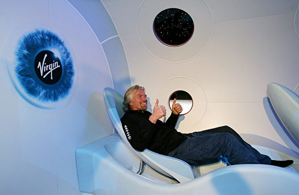 维珍银河创始人理查德‧布兰森试坐太空船座椅。