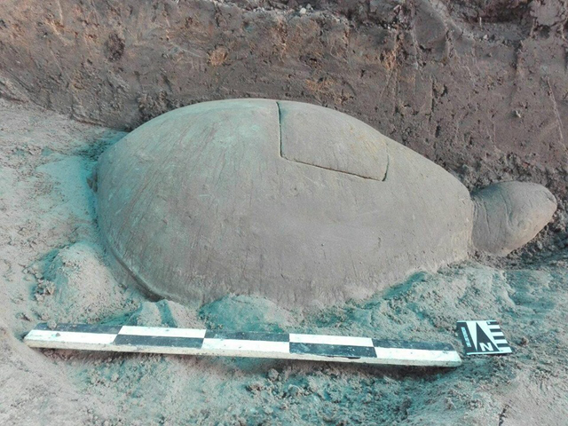 柬埔寨考古学家在吴哥神庙遗址中,意外挖出一个古老乌龟石像,已有1千多年的历史,有趣的是,龟壳上面并没有任何雕刻,而其背上还有一个矩形盖子,考古学家推测,里面可能藏有东西,由于石像还有半身嵌在地上,预计在未来几周内,以不破坏石像的方式取出。