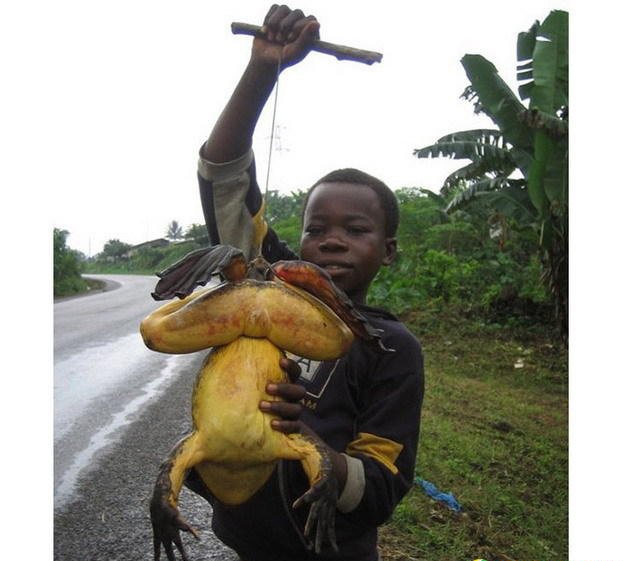 非洲巨蛙原产地是赤道几内亚和喀麦隆,它的体重可达到3.2公斤,它们的食物范围较广,例如:昆虫和蛇,甚至还会吞食体型较小的同类青蛙。