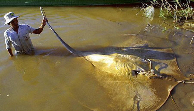 淡水黄貂鱼濒危灭绝,但是偶然间它们会带来巨大的惊喜,如图所示,这是渔民发现的一条巨型黄貂鱼,体重达到590公斤。