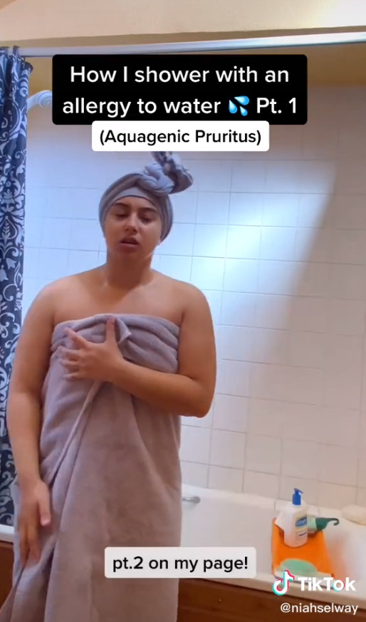 妮亚在TikTok上分享她洗澡艰辛的过程,需要做很多事前步骤监测身体的状况。首先她要先量血压和体温,沐浴产品也一定要是过敏肌专用。妮亚在淋浴前会先用刷子干刷过皮肤,去除表面脏污和老废角质。开始淋浴后大约5到10分钟身体就会开始灼热痛痒,她洗好澡后不像一般人觉得舒爽轻松,反而痛苦难耐。
