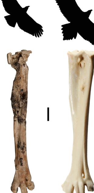 Archaehierax sylvestris的假设轮廓和跗跖骨化石(左)与楔尾鹰(右)作比较,比例尺长10毫米。(J Blokland/Flinders University提供)