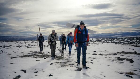 冰川考古学家们徒步三小时才到达滑雪板所在的地点。(Andreas Christoffer Nilsson, secretsoftheice.com提供)