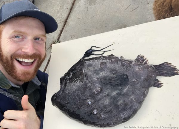 根据《卫报》报道,上周,加州一名冲浪者在圣地牙哥海岸的岩石附近,发现了一只怪鱼,起初他以为是一颗焦油球,近看后发现是一只满口利齿、头上长了奇怪触须的黑色怪鱼,吓得他赶紧通报相关单位,经过专家确认后,这只鱼并非变种,而是生长于深海的“相模湾鞭冠鮟鱇(Pacific Footballfish)”。