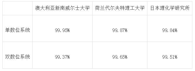 另外两份研究分别由荷兰代尔夫特理工大学(Delft University of Technology)和日本理化学研究所(RIKEN)完成,采用的是不一样的技术——使用困在硅和硅锗合金制成的量子点内的自旋电子作为量子数位。这两个研究组设计的单数位和双数位系统的准确率也都超过了99%,详见下表。