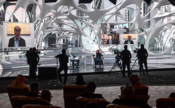 在科技巨头追求商业利润的驱动下,元宇宙这个虚拟社会的概念正在走向现实,走向被庸俗毁灭的道路。图为2021年1月27日,约100名商业大亨虚拟参加沙特阿拉伯开设的投资论坛并发言。(Fayen Nureldine / AFP)