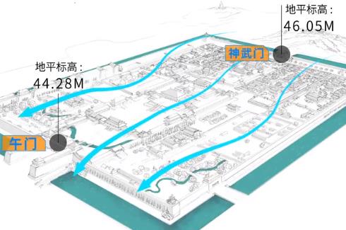 而故宫内的雨水最终都将通过干线与支线的排水渠道,流入内金水河,再沿着河渠至东华门南边的水闸流出,与外金水河汇合,再者,古人不仅设有精密的排水系统,还依故宫的地势规划,由于北京北依燕山,东临渤海,可知北京地形是西北高、东南低,因此北京的水系为东南向,古人利用此特点,将故宫内的水系设计成北高南低。