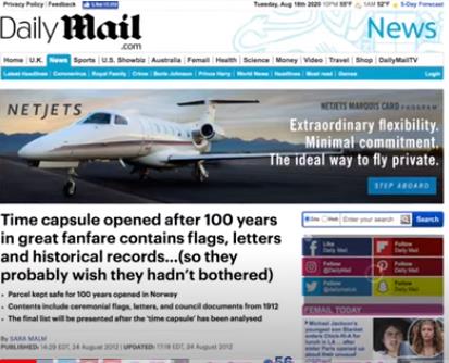 在全球关注下,捆绑百年包裹的麻绳被市长亲自剪开,但让人失望的是这个“时间胶囊”内并没有珍贵的历史文物、珠宝或石油股票,只有一捆信件(包括约翰的信)、几面旗帜、一些收据和两张报纸。大家注意,正是这两张是此次事件的关键所在。