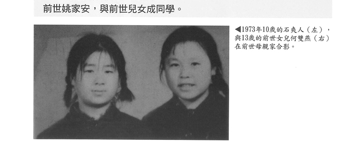 后来这个事传到了两个孩子的耳中,他们回家去问了奶奶,奶奶说还有这样的事?那把那个小女孩领回来看看吧!于是石爽人就被孩子们带回了家,她没有要任何人指路,凭前世记忆找到了姚家安的家,并当着所有人的面说出了他们的脾气和一些生活经历,姚家人一听还真是这样。之后姚家就把石爽人也当成了家人。