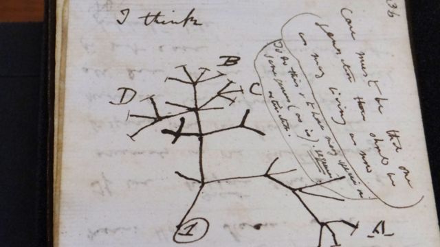 达尔文著名的生命之树素描就绘制在其中的一簿上;生命之树试图展示物种之间的演进关系。