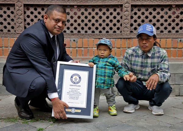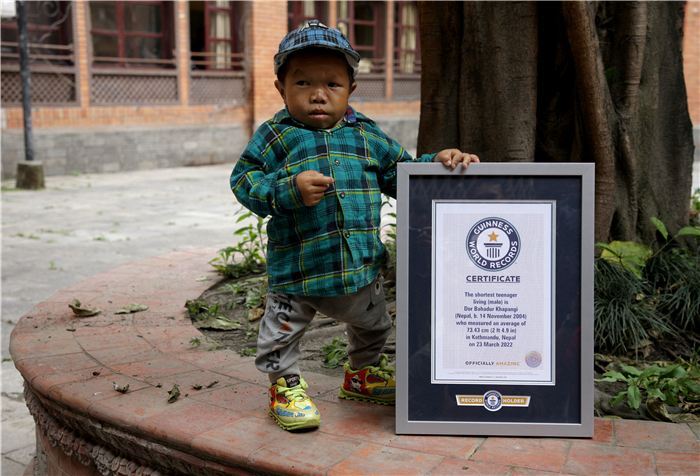 尼泊尔的18岁少年卡邦吉(Dor Bahadur Khapangi)23日在首都加德满都获颁吉尼斯世界纪录证书,他以73.43厘米的身高被认证为目前“世界上最矮的少年”。前一位曾获这项头衔的少年玛加尔(Khagendra Thapa Magar)同样来自尼泊尔,18岁时以65.58厘米被认证,但他已不幸于2020年离世,得年27岁。