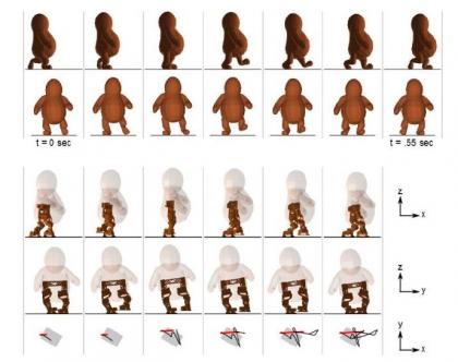 研究人员首先建立和卡通形象一样走路运动夸张的3D动画模型,然后3D打印出匹配虚拟角色构造的机器人腿部件。