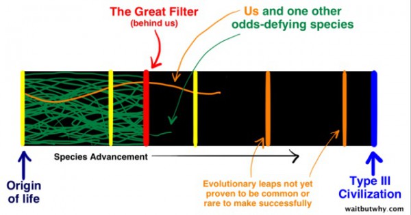 我们希望的是大过滤器是在我们后面,我们成功地超越它了,这将意味着生命走要到我们智慧程度是极为罕见的。下图显示了只有两个物种通过了,而我们是其中之一。