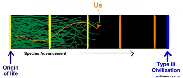 如果X行星有类似于地球的历史,让我们来看看今天他们的文明会是在哪(用橙色时间刻度作为参考,来说明绿色的时间刻度是如何巨大):