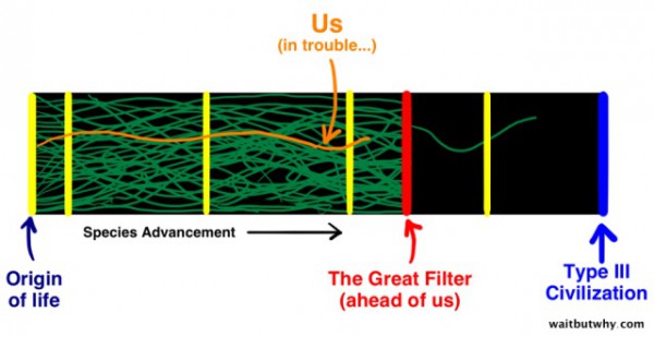 如果我们既不罕见也不是很早,第1组思想家得出结论认为大过滤器必定是在我们的未来。这表示生命规律地发展到我们现在的样子,但有东西阻止生命更往前发展来到达一个前所未见的高智慧,我们也不可能是一个例外。