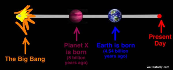 事情变得更奇怪了。我们的太阳相较于宇宙的寿命是比较年轻的。外面有更远古的恒星拥有远古类地行星,而理论上其文明应该是要远比我们的更先进。举一个例子,我们来比较我们45.4亿年的地球跟一个假想中的80亿年的X行星。