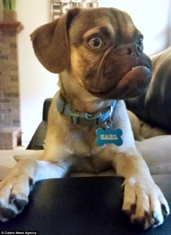 尽管这只小狗看上去好像一直都在不高兴着,但是它的主人Derek Bloomfield说:“Earl其实是一只精力充沛并且喜欢吃零食的小狗,它总是会享受着日光浴以及在公园中追着球跑。”Earl是第二代杂种狗——它的父母也都是杂种。