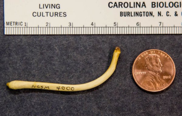 这根可爱的小骨头叫做“阴茎骨”,几乎所有哺乳动物都有阴茎骨,除了人类没有。北卡罗来纳自然科学博物馆的这件收藏是来自一只浣熊。哺乳动物部门的负责人Lisa Gatens说有些猎人把它当作牙签用。