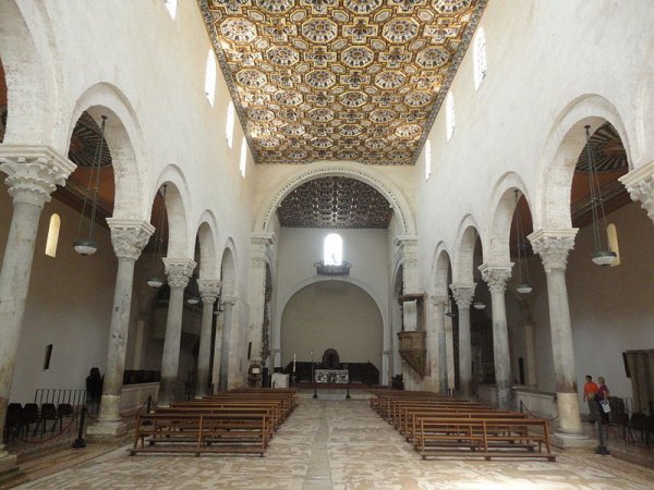 在阳光的照耀下,大教堂的外部金光闪闪。这栋建于1088年的建筑外面看上去很简单,只有一些拱形的窗户和雕刻的柱头。但在内部,各种野生动物、圣经人物、奇妙的生物在教堂的地板腾跃。12世纪60年代,一个名叫Pantaleone的修道士和他的工匠团队将这些神秘的图案镶嵌在了地板上。这是欧洲最大的镶嵌细工(马赛克)之一,描述了历史上所有重要的故事和人物:生命之树、亚当夏娃被逐出伊甸园、亚历山大大帝、大象、狮身人面像、半人马,以及其它很多东西。