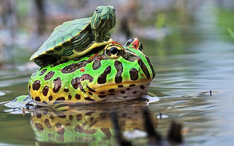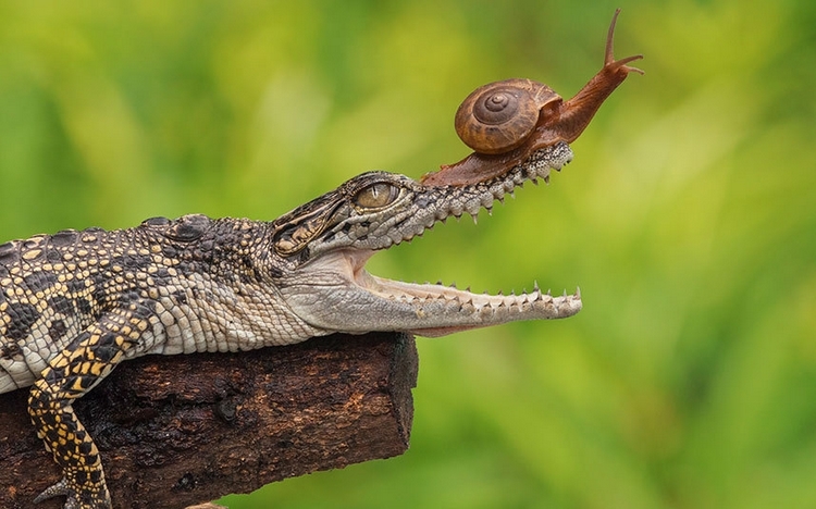 小青蛙得意地在蜗牛壳上东张西望;蹄兔儿小心地站在乌龟背上审视思考下一步该咋办;海豹很生猛,去旅行时,竟然搭着座头鲸这个顺风车;白鹭则完全疯了,为了觅食直接站在了鳄鱼背上……动物们天生卖俏的萌相和搭顺风车的梦想就这么合二为一了!