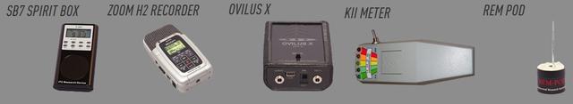 “幽灵猎人”使用的各种探测设备,包括电磁场探测器、SB7“灵魂盒子”等