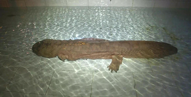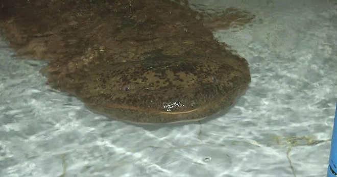 近日,重庆市一溶洞内发现一条巨形野生娃娃鱼,体长1.4米,重量约104斤,专家初测年龄可能超过两百岁。娃娃鱼是国家二级保护动物,目前,这条巨型娃娃鱼已被转移到专门地点实施保护,并将针对它开展科研工作。