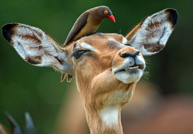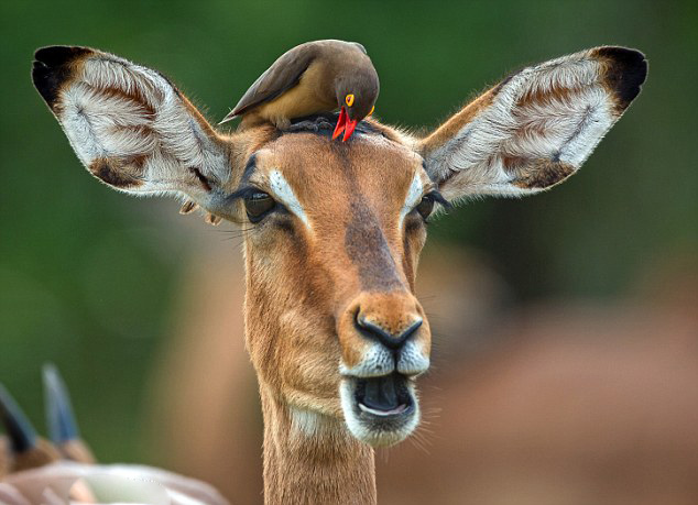 在南非克鲁格国家公园里,一位摄影师抓拍到红嘴牛椋鸟为黑斑羚挠痒痒的图片。图片中的黑斑羚一脸享受,表情搞怪,让人喜不自禁。