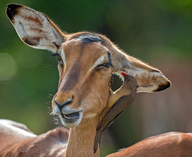 图片中的黑斑羚显然很享受红嘴牛椋鸟对自己的“服务”,脸上的表情也是丰富多样:一会兴奋地微张着嘴,一会满足地眯着眼,一会耷拉了左耳以便红嘴牛椋鸟更好地帮自己挠痒。