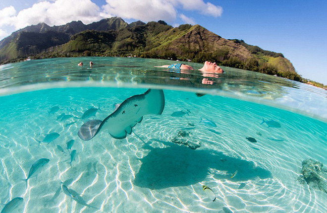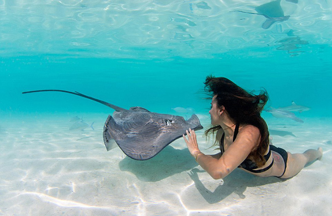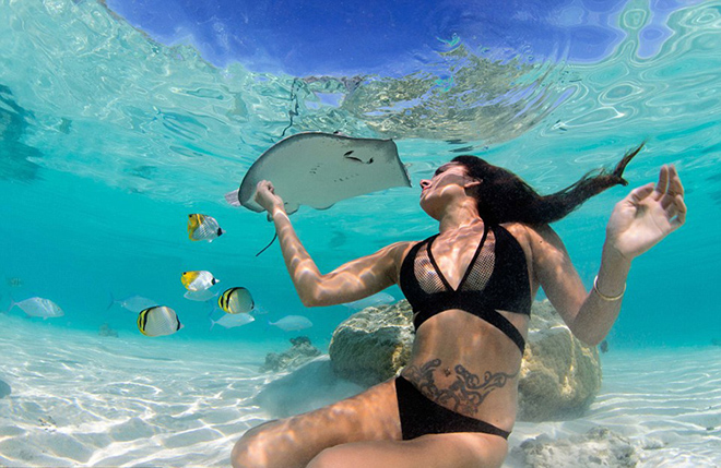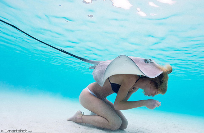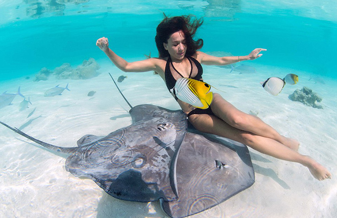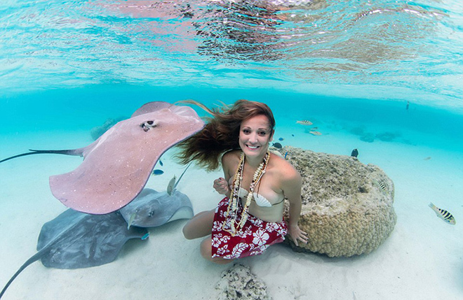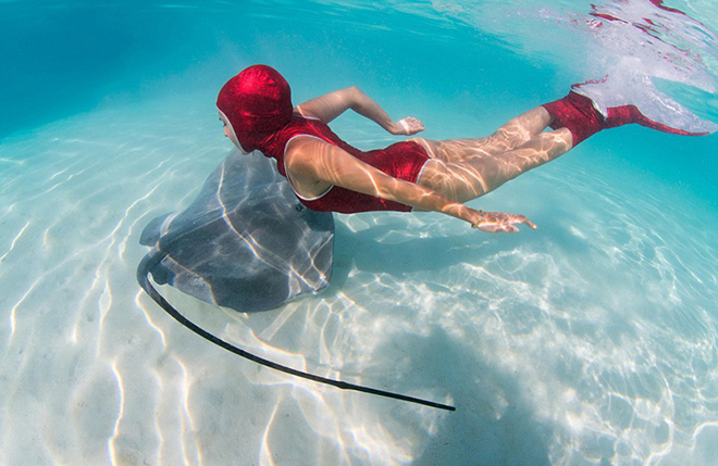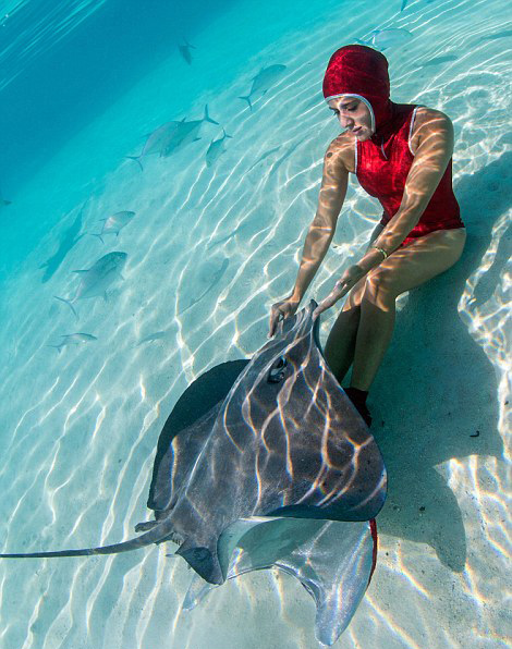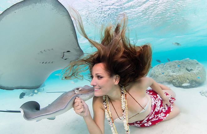 55岁的水下摄影师克里斯蒂安(Christian Coulombe)在南太平洋莫雷阿岛附近海中拍摄了一组精美绝伦的照片,展现了三名靓丽的模特与20条剧毒刺鳐嬉戏共舞的场景。